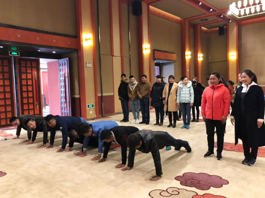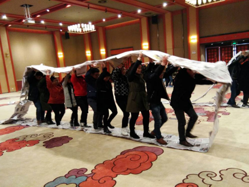 (圖為團隊拓展活動“齊眉棍”)